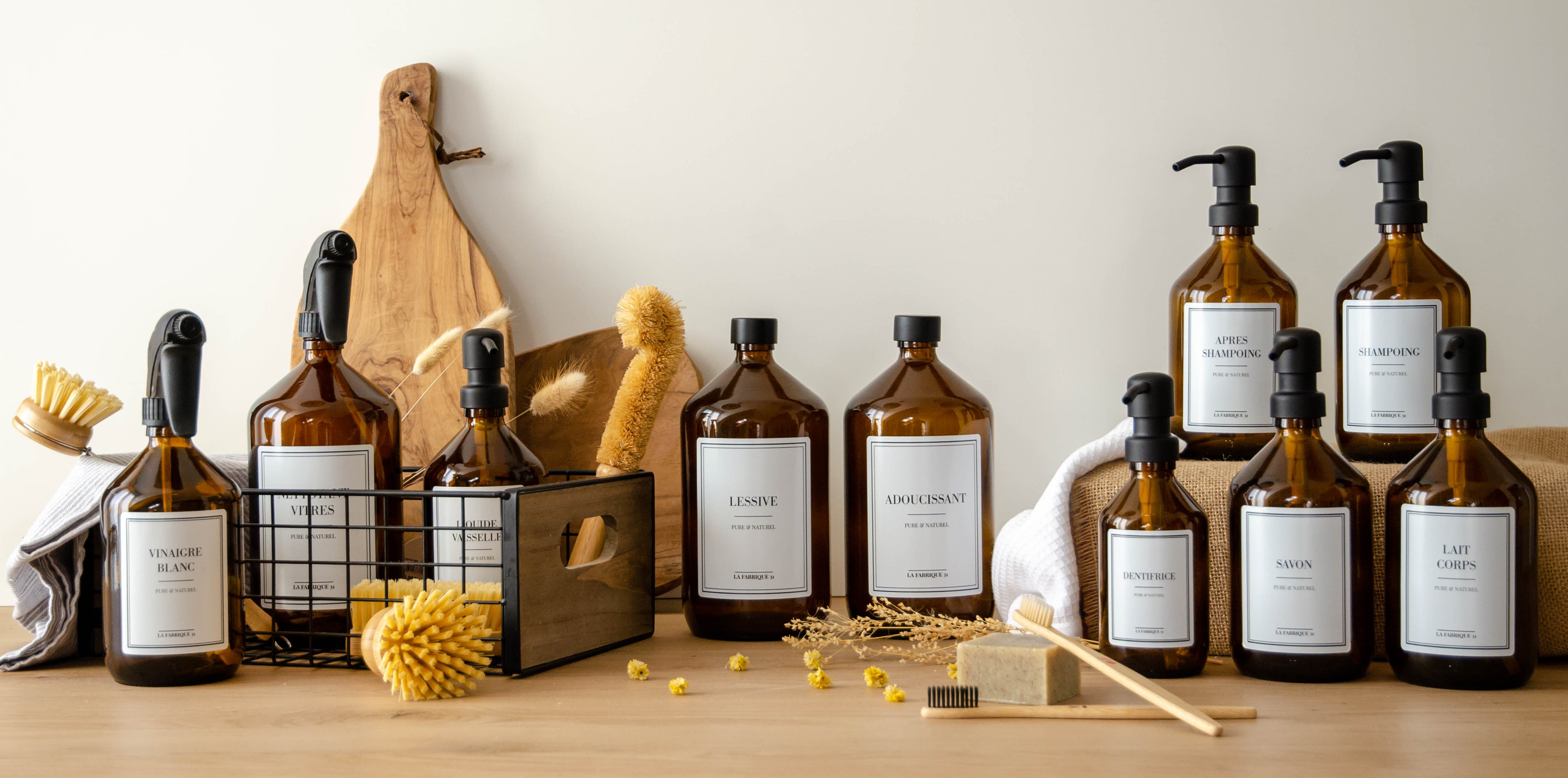 Ensemble de flacons et bocaux pour sublimer votre buanderie et conserver votre lessive et vos produits naturelles pour prendre soin du linge et de la maison.